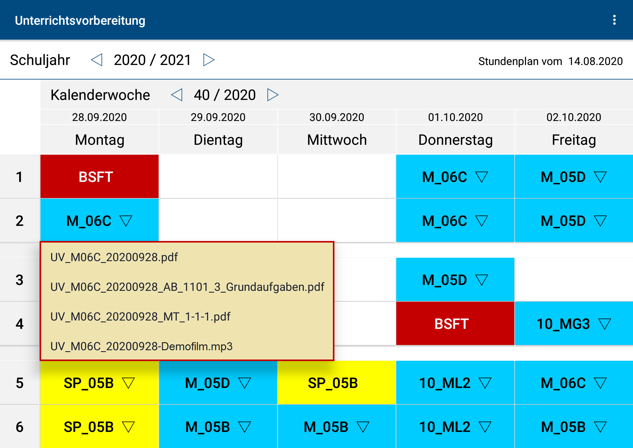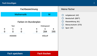 For a clearer presentation in the timetable, you can design the individual subjects in different colors under „Colors in the timetable”.