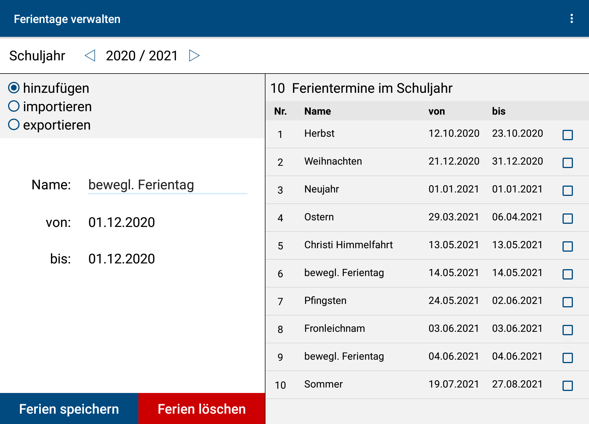 Then use the arrow keys ◁ bzw. ▷ to navigate to the correct school year. Then choose a name and enter the beginning and end of the vacation in question.