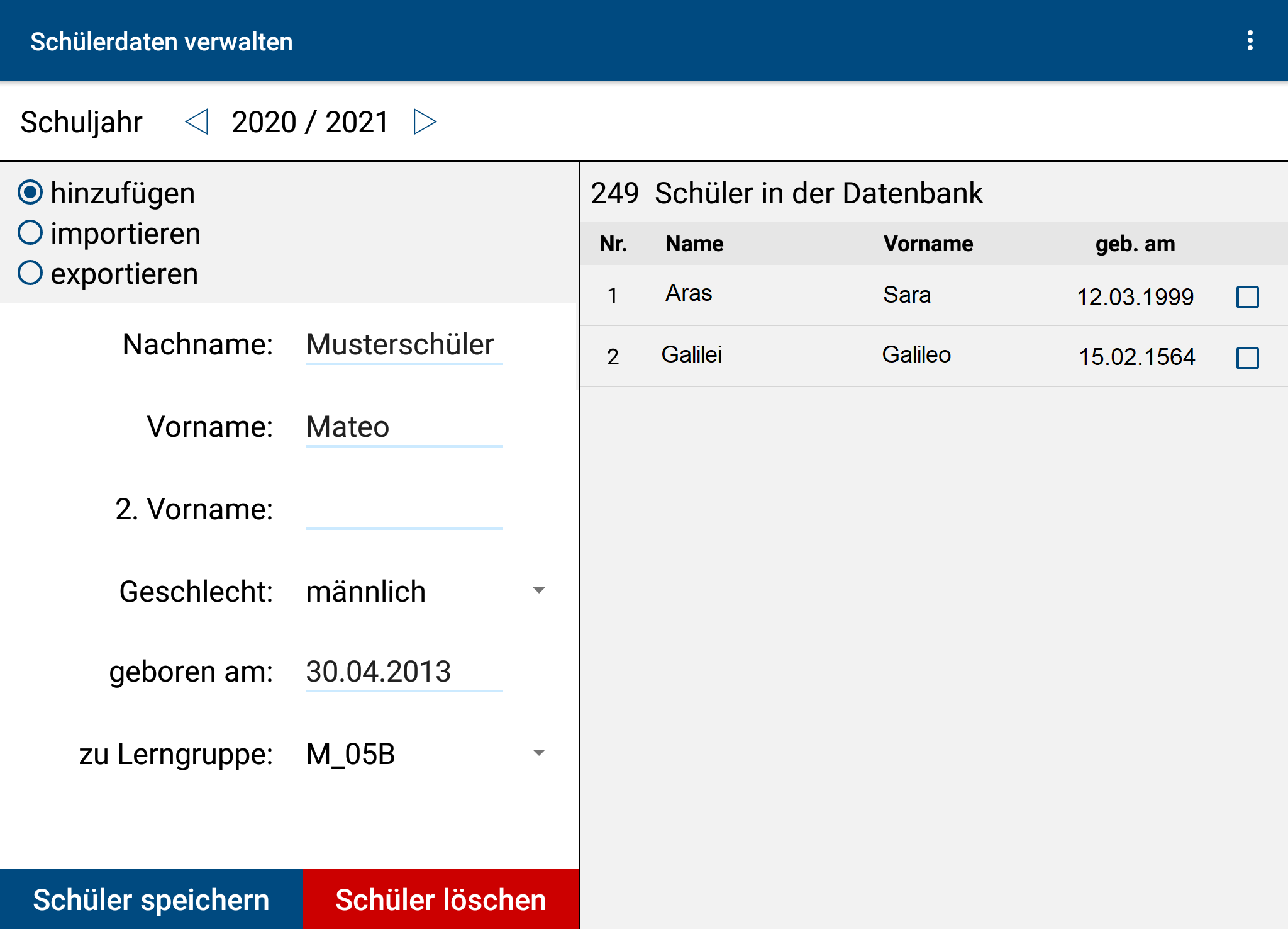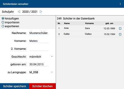 After saving, the data of the new student (in the example: Mateo sample student, born on April 30th, 2013, student of learning group M_5B) appear in the alphabetically ordered list on the right.
