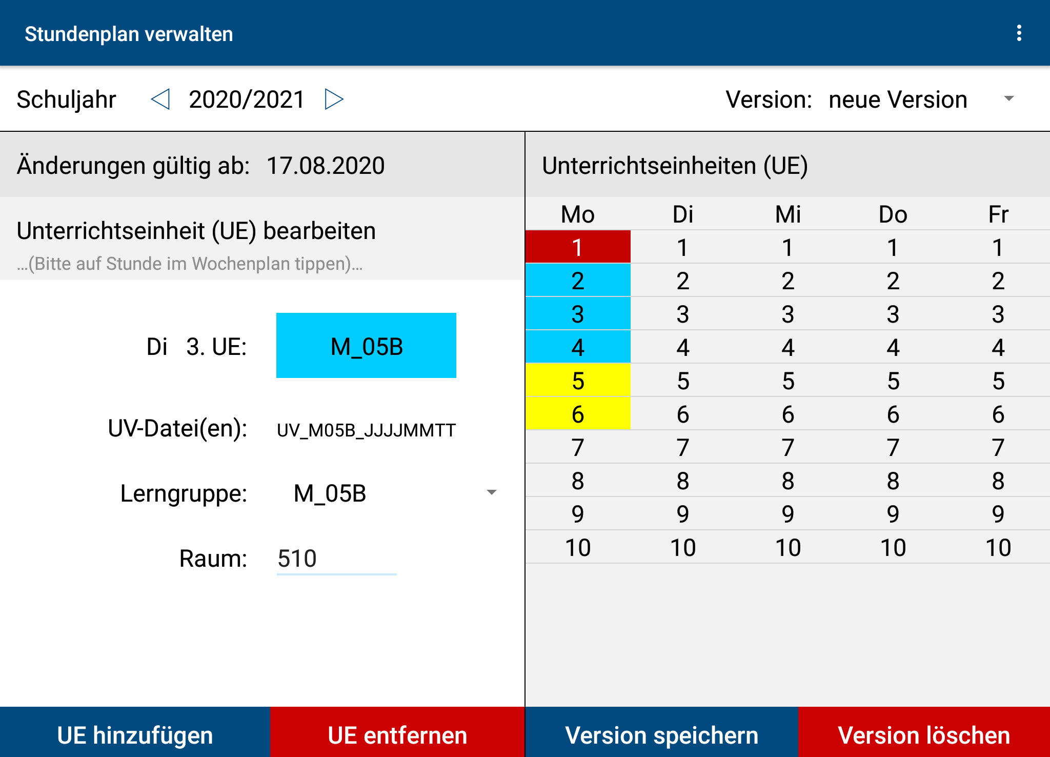 Then tap on the teaching unit (UE) in the timetable on the right that you would like to occupy with a study group (in the example: Tuesday 3rd UE) and enter the relevant data in the left area. After you press „Add UE”, class 5B in mathematics appears as 3rd UE on Tuesdays (unsaved).